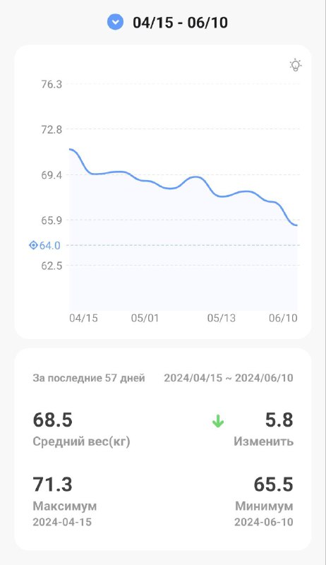 В середине апреля моя масса была 71.35 килограмм, жир составлял 21.6%. Менее, чем за 2 месяца у меня получилось похудеть до 65.5 килограмм, а жир стал стал составлять 18.1%. Что я для этого делал? На самом деле, просто меньше ел. Прочитав несколько статей, выяснил, что рекомендуют держать дефицит калорий около 25%. Узнал, сколько мне нужно потреблять, чтобы вес не менялся, и просто ввёл значение в приложение на четверть меньше.